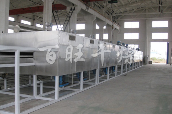 物料由加料器均匀地铺在网带上,网带一般采用12-60目不锈钢丝网,由传动装置拖动在干燥机内移动。干燥机由若干单元组成,每一单元热风独立循环,部分尾气由专门排湿风机排出,废气由调节阀控制,热气由下往上或由上往下穿过铺满物料的网带完成热量与质量传递的进程,带走物料水份。网带缓慢移动,运行速度可根据物料温度自由调节,干燥后的成品连续落入收料器中。上下循环单元根据用户需要可灵活配备,单元数量亦可根据需要选取。