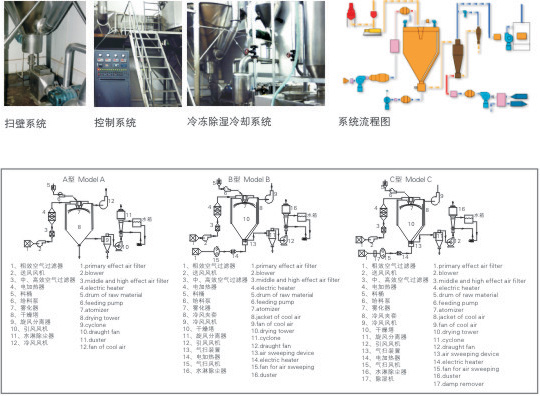 基本原理:中药浸膏高速离心喷雾装置是离心式喷雾干燥技术在特定物料干燥中的应用 ,也是利用高速离心式雾化器使物料分散成雾状,与热空气所充分接触 ,完成瞬间干燥,形成粉状成品的干燥装置。