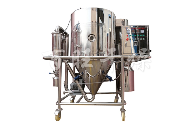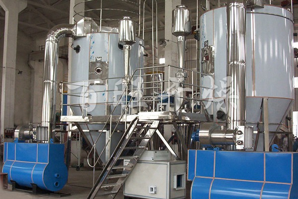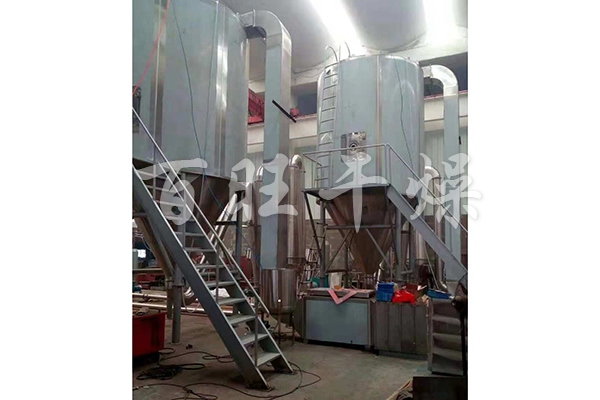 空气经过过滤和加热,进入干燥器顶部空气分配器,热空气呈螺旋状均匀地进入干燥室。料液经塔体顶部的高速离心雾化器,(旋转)喷雾成极细微的雾状液珠,与热空气并流接触,在极短的时间内可干燥为成品。成品连续地由干燥塔底部和旋风分离器中输出,废气由风机排空。