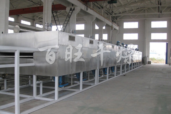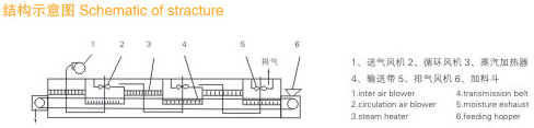 物料由加料器均匀地铺在网带上,网带一般采用12-60目不锈钢丝网,由传动装置拖动在干燥机内移动。干燥机由若干单元组成,每一单元热风独立循环,部分尾气由专门排湿风机排出,废气由调节阀控制,热气由下往上或由上往下穿过铺满物料的网带完成热量与质量传递的进程,带走物料水份。网带缓慢移动,运行速度可根据物料温度自由调节,干燥后的成品连续落入收料器中。上下循环单元根据用户需要可灵活配备,单元数量亦可根据需要选取。