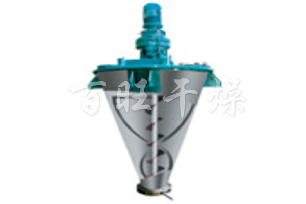 由摆线针轮减速机连接中心螺杆及外层螺带以相同转速转动。工作时,中心螺杆将混合物料由底部提升到顶部,同时线速度较大的外部螺带将物料由下而上沿锥形筒壁盘提升,二种运动在离心力作用下又将物料沿切线方向抛向空间,物料产生强烈的对流剪切、扩散,从而达到快速混合的目的。(螺杆也可做成反向螺杆)。