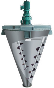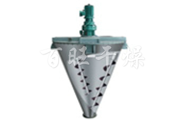 由螺旋的公 、自转使物料在锥体内产生复合运动,主要产生四种运动形式: 1. 螺旋沿壁公转,使物料沿锥壁作圆周运动; 2. 螺旋自转使物料自锥底沿螺旋上升; 3. 螺旋的公 、自转复合运动使一部分物料被吸收到螺旋圆柱面内同时受螺旋自转的离心力作用使螺旋圆柱面内的一部分物料向锥体径向排放; 4. 上升的物料受自身重力作用下降 。四种运动在混合机内产生对流、剪切 、扩散、从而达到快速均匀混合的目的。